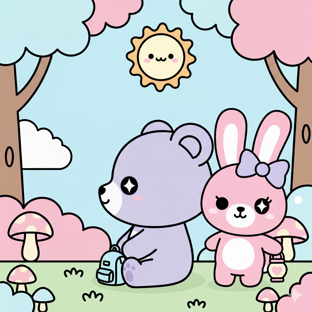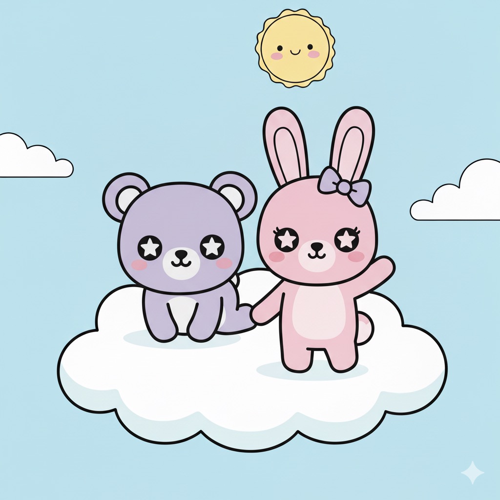 Una dulce colección de ilustraciones protagonizadas por Luna (la conejita rosa) y Coco (el osito lila), explorando un mundo de fantasía con una estética flat kawaii encantadora. La galería muestra a los amigos desde sus momentos de aventura en el bosque con linternas brillantes hasta escenas de relax juntos sentados en suaves nubes y disfrutando de un día de helados bajo el sol. Una celebración de la amistad y el diseño adorable.