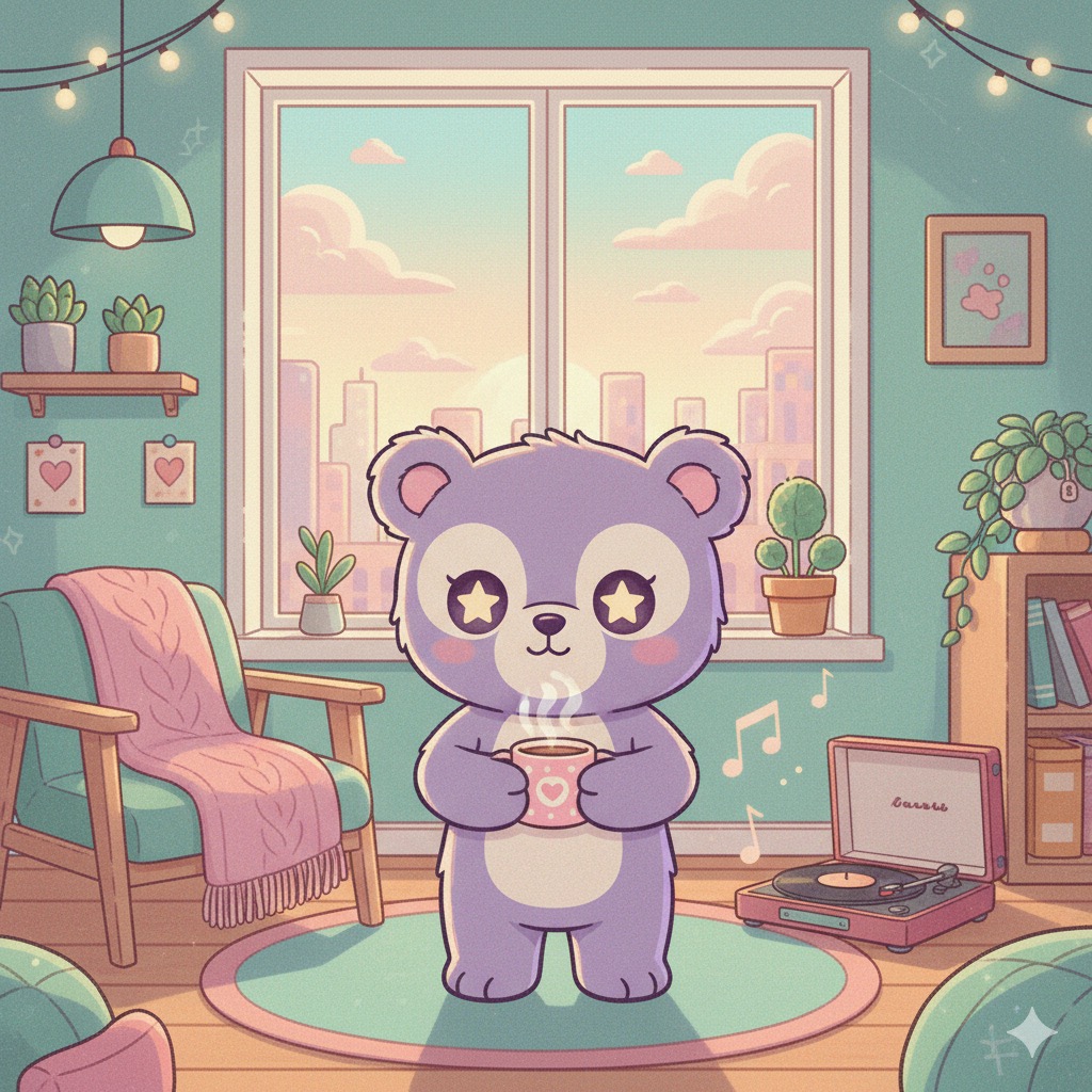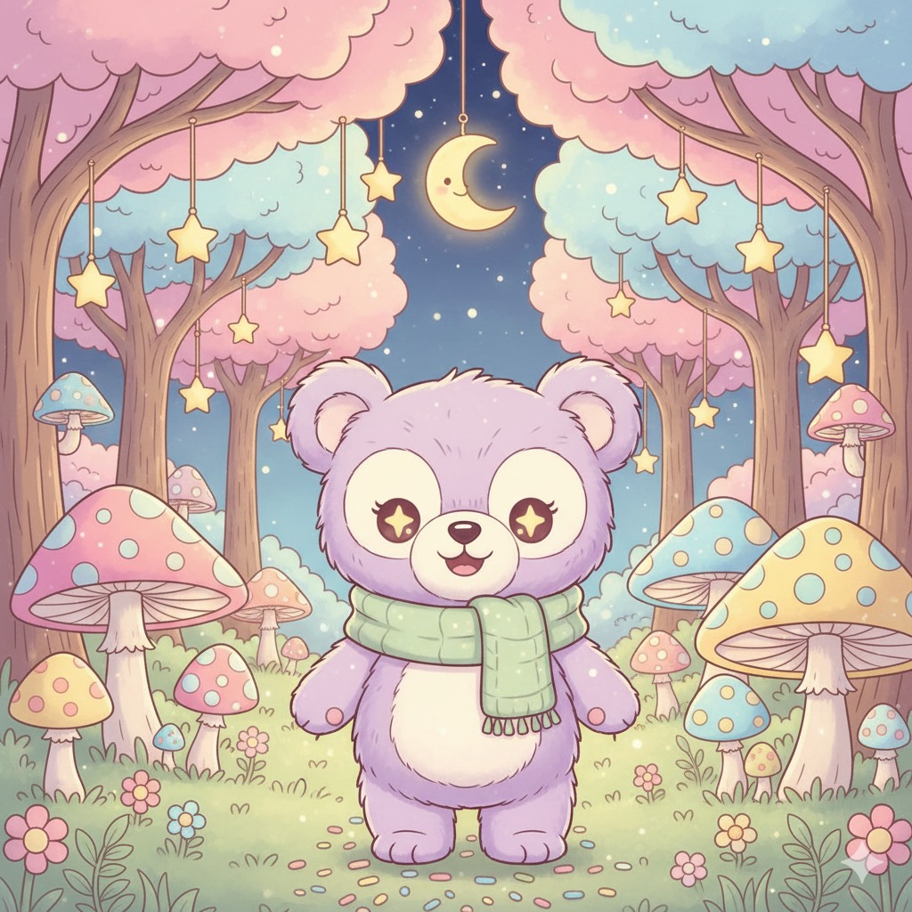 Coco es un pequeño osito de peluche color morado pastel, con una bufanda llena de estrellitas que nunca se quita. Es curioso, valiente y siempre está dispuesto a cuidar de quienes quiere.