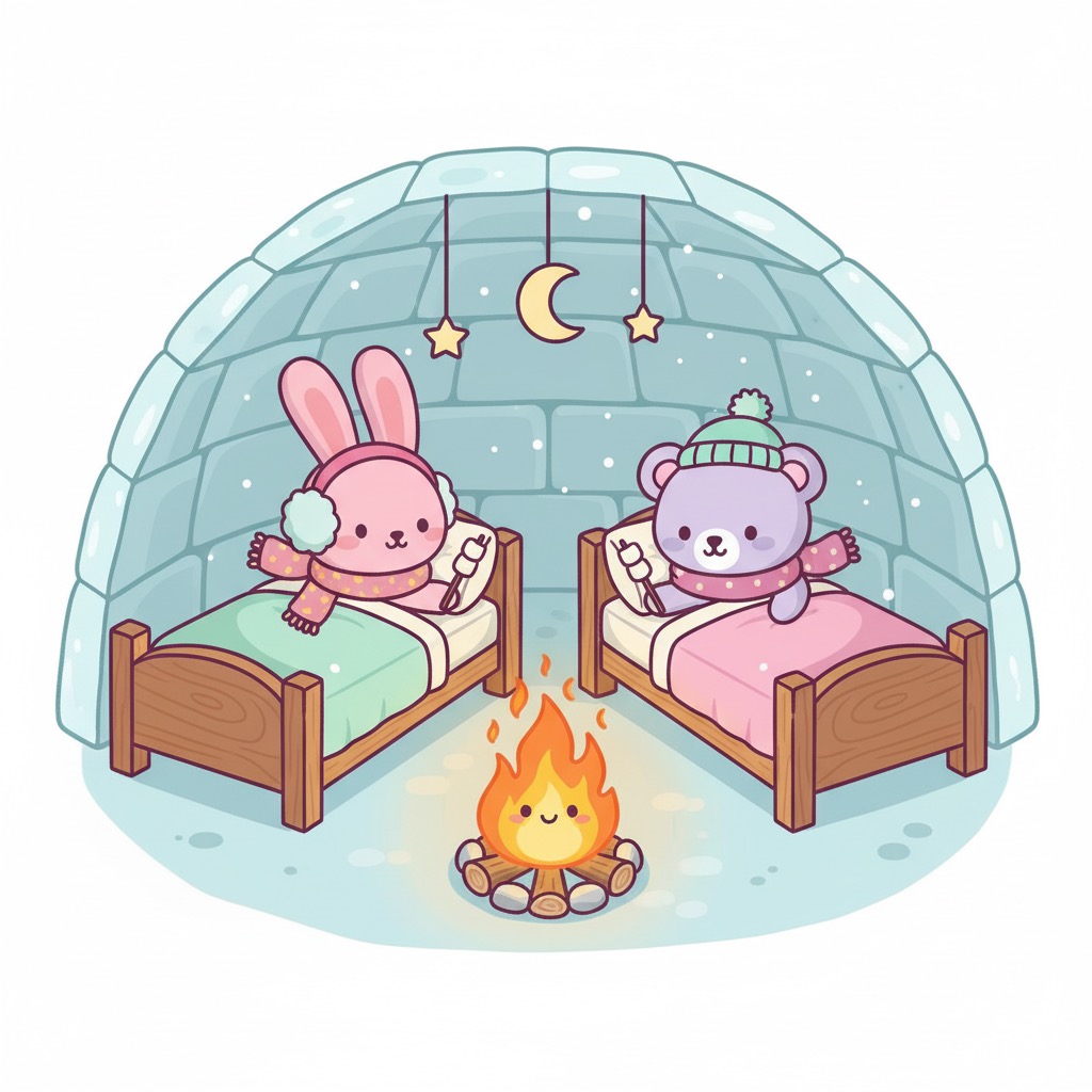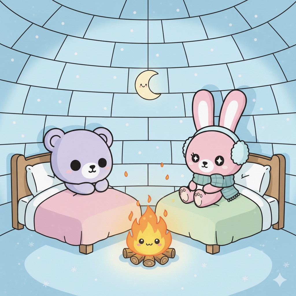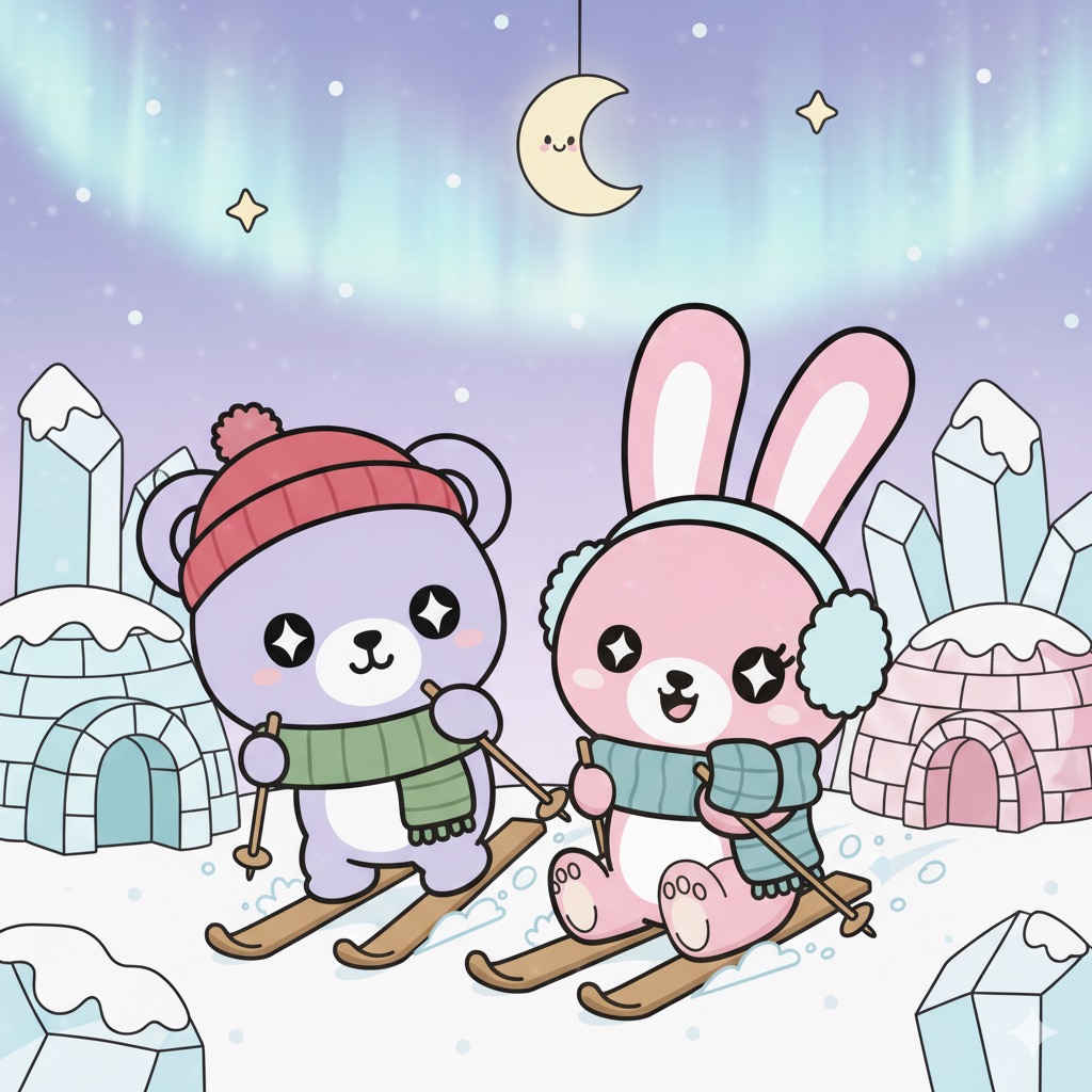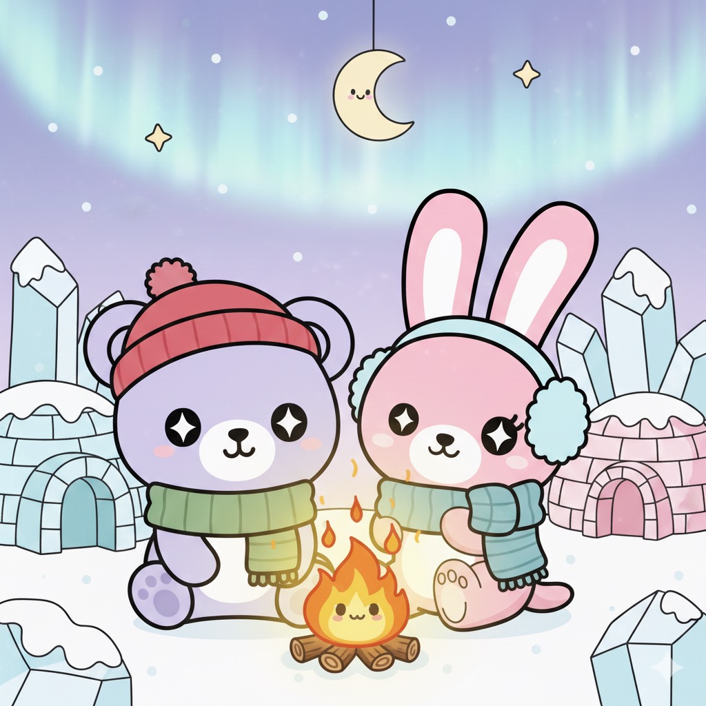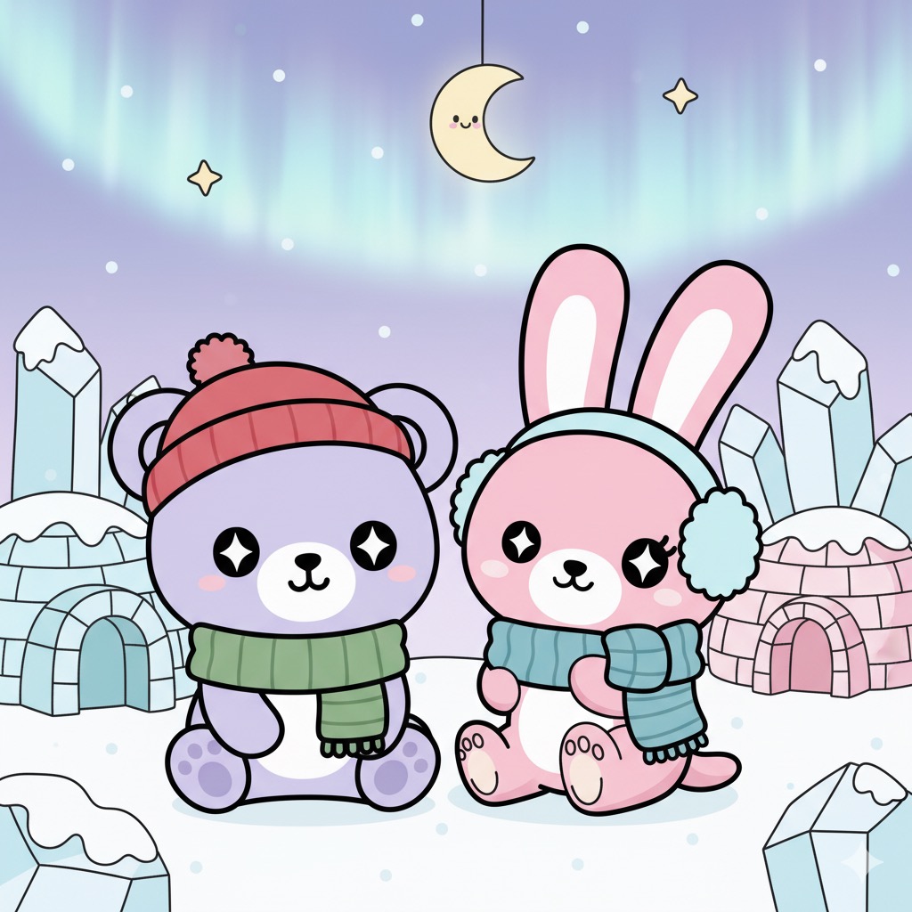 En el corazón de un vasto y brillante Polo Norte, donde las auroras boreales danzaban en el cielo como cintas de seda y el aire fresco pellizcaba las narices, vivían dos pequeños y adorables exploradores: Coco, el osito lila y blanco con su gorro y bufanda, y Luna, la conejita rosa con sus orejeras y bufanda a juego.